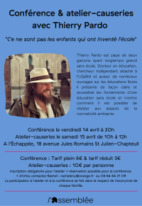 « L’éducation normal n’existe pas, elle est toujours le résultat d’une époque et d’un certain nombre de choix. Comment offrir à nos enfants des environnements épanouissants, quels repères pour les parents, où va la liberté éducative ? Et si nous en parlions ? »(Texte Thierry Pardo )