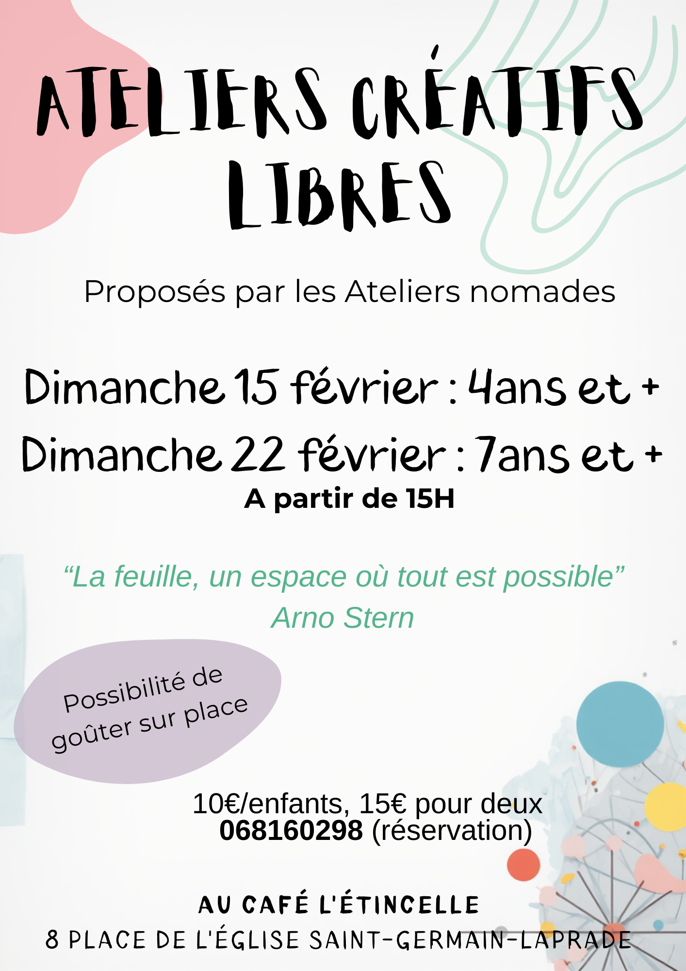Nous vous proposons à nouveau des « ateliers libres » animés par Les Ateliers Nomades. Une occasion d’y participer pour ceux qui avaient manqué celui de décembre 🎨