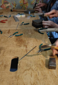 Des outils de base (pince, lime, marteau, papier émeri, tas) ,la matière et des modèles sont mis à disposition.