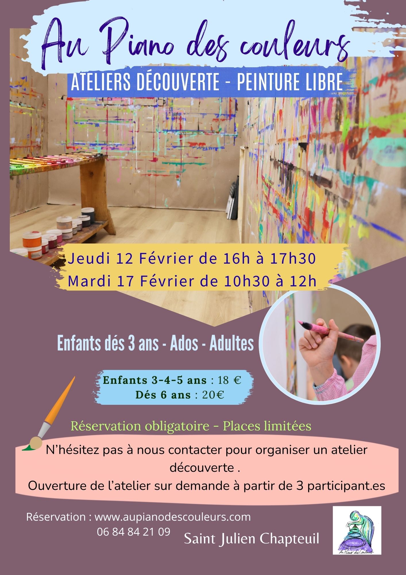 L’atelier Au Piano des couleurs ouvre ses portes pour un atelier découverte le 12 février de 16h à 17h30 .