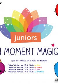 Atelier Mon Moment Magique Juniors sur le thème des Émotions Nous sommes tous traversés par diverses émotions qui cachent des besoins. Apprendre aux enfants à les nommer, les reconnaître, les accueillir, les canaliser, est important. C'est ce que je vous propose de faire, de manière ludique, à travers ce cycle de 4 Ateliers sur le Thème des émotions. A chaque atelier, nous explorerons une des 4 principales émotions ( Joie, Colère, Peur, Tristesse ). Au programme: Météo intérieure?, centrage et lecture, gestion des émotions à travers la respiration?, yoga?♀️, jeux coopératifs, défoulage, expression dessinée des émotions... L'idéal est de participer aux quatre ateliers mais si ce n'est pas possible, vous pouvez inscrire votre enfant à un, deux ou trois ateliers. Offre cycle 4 Ateliers: 40€ soit 10€/l'atelier (au lieu de 60€ ou 15€/l'atelier)