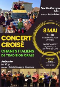 L’ensemble « Voci in Campo » d’Arles dirigé par Xavier Rebut et l’ensemble « AnDante » du Puy dirigé par Colette Magnand-Descours vous propose un concert de chants italiens de tradition orale dans lequel ils entremêleront leurs répertoires.