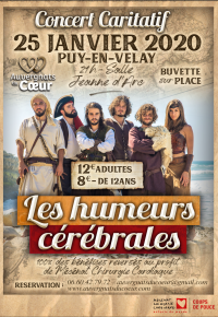 L’association Auvergnats du Coeur vous invite à son premier concert solidaire, le samedi 25 janvier 2020 à compter de 21h à la salle Jeanne d’Arc au Puy-en-Velay. Le groupe corrézien, Les Humeurs Cérébrales, nous feront le plaisir de nous plonger dans leur univers, une musique « celtico-médiévale », aux accents rock’n’roll. Véritable spectacle sur scène, tous les ingrédients seront au rendez-vous pour nous réchauffer les cœurs en ce soir d'hiver. Informations pratiques et tarifs : - Samedi 25 janvier 2020 – Ouverture des portes à 19h30 – Début du concert à 21h - Salle Jeanne d’Arc – 16, avenue de la Cathédrale – 43000 Le Puy-en-Velay - 12€ adultes / 8€ pour les enfants de moins de 12 ans - Vestiaire & Buvette sur place Réservation des billets : - par mail : auvergnatsducoeur@gmail.com - par tél : 06.60.42.79.72 - sur la plateforme sécurisée Hello Asso : https://www.helloasso.com/associations/auvergnats-du-coeur/evenements/concert-caritatif - sur notre site internet : www.auvergnatsducoeur.com