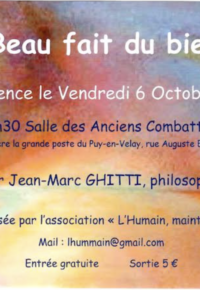 Dans un premier temps l’association propose une conférence inaugurale sur le thème “Le Beau fait-il du bien ?”, le vendredi 6 octobre 2023 à 18 h 30 à la salle des Anciens Combattants, rue Auguste-Eymard au Puy-en-Velay, dont vous trouverez le tract-invitation en pièce jointe.