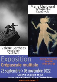 La galerie En plein coeur expose deux artistes de Haute- Loire pour l’événement Crépuscule multiple. Valérie Berthéas présente ses sculptures noires, calcinées en terre crue et cuites. Marie Chaloyard propose une installations de cyanotypes grand format et des photographies noir et blanc autour du portrait.