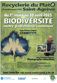 Tout au long des mois de mars et avril, dans le cadre de l’exposition « Biodiversité, notre patrimoine commun » organisée par la Recyclerie du PlatO, la biodiversité sera mise en valeur par deux artistes qui exposent au PlatO, lieu d’exposition et de création accolé à la recyclerie de Saint-Agrève : l’artiste plasticienne Florence Dejans et le photographe Jean-François Convers y déclinent à travers leurs arts respectifs la beauté de la nature et son infinie subtilité.