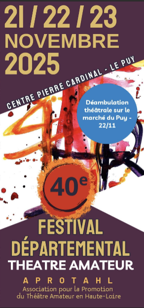 Du 21 au 23 novembre, retrouvez la 40eme édition du festival de théâtre amateur en Haute-Loire. Par l’association APROTAHL (association pour la promotion du théâtre amateur en Haute-Loire).