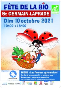 Marché bio et écologique La Fête de la Bio compte chaque année un marché de producteurs biologiques de Haute-Loire et des départements voisins. Ce marché est élargi à l’artisanat local écologique, l'éco-habitat, les cosmétiques... Les associations locales en lien avec la préservation de l’environnement, et l’agriculture biologique seront également présentes. Cette année, environ 70 exposants seront présents le long des allées de la fête, dont 35 producteurs et une dizaine de transformateurs de produits alimentaires biologiques, une dizaine d’associations, ainsi qu’une dizaine d’artisans ou auto-entrepreneurs et 5 revendeurs. Dimanche 10 octobre 2021, toute la journée, cercle de loisirs et centre bourg Masque obligatoire Animations autour du thème annuel : les femmes agricultrices Projection du film « Je, tu, elles, les femmes en agriculture » de Aurélia Etienne Cathy est chevrière sur la montagne ardèchoise ; Julie s’installe en Drôme ; Monique a vécu la vie à la ferme au sein de sa belle famille et est maintenant retraitée ; Frédérique s’est installée seule avec deux jeunes enfants ; Claire s’est battue pour obtenir son statut d’exploitante agricole ; Guillaine se demande si elle peut s’installer seule en élevage ; toutes vivent leur activité d’agricultrice au sein d’un territoire rural où leur place de femme les questionne régulièrement… Accompagnées par les CIVAM, elles et douze autres femmes agricultrices de la Drôme et de l’Ardèche s’autorisent durant l’hiver à faire un pas de côté ; prendre un peu de recul par rapport à leur quotidien et se poser certaines questions, plus ou moins confortables, parfois bien plus bouleversantes qu’elles n’y paraissent… Cette aventure est à la fois une réflexion collective via la recherche action, et une introspection individuelle d’un groupe de femmes qui se questionnent, qui avancent, qui se rencontrent. La projection sera suivie d’une table ronde, animée par le CIDFF (Centre d’Information sur le Droit des Femmes et des Familles) de Haute-Loire, avec les témoignages d’agricultrices de Haute-Loire. Dimanche 10 octobre 2021, à 15h, au centre culturel de Saint Germain Laprade – Gratuit Passe sanitaire requis Exposition sur le thème « Les femmes agricultrices » Pour compléter le film présenté, une exposition présentera le projet du CIVAM d’Ardèche et le résultat de l’enquête menée par ces femmes agricultrices. Cette exposition présentera également des photos issues des témoignages. Dimanche 10 octobre 2021, toute la journée, dans la cour de l’école – Gratuit Passe sanitaire requis Autres animations Arpentage du livre « Printemps silencieux » de Rachel Carson, par la librairie Pied de biche Marque Page Un arpentage est une lecture collective d’un livre qui permet de découvrir très rapidement son contenu et d’en parler ensemble, de le rendre plus accessible qu'il ne l'aurait été pour un lecteur seul. Printemps silencieux est le livre qui permis la prise de conscience aux Etats-Unis et dans le monde de l’impact global des pesticides et du DDT sur tout le vivant. Après être un peu tombé dans l’oubli, il a été redécouvert il y a quelques années pour ses qualités de vulgarisation et d’accessibilité. Il fait encore référence aujourd’hui.