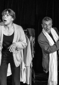 Sur le plateau, 2 comédiens (Diane Julien Josy Ju et Christophe Huet) vêtus de noir, des costumes, des accessoires et un escabeau.
