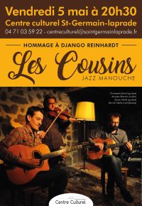 Christophe Bariol (guitare), Jacques Bresson (violon), Xavier Merle (guitare) et Yannick Merle (contrebasse) vous donnent rendez-vous vendredi 5 mai à 20h30 au centre culturel de Saint-Germain-Laprade. Les Cousins vont rendre hommage au « Roi du jazz manouche », Django Reinhardt, qui nous a quitté le 16 mai 1953 à seulement 43 ans. Et qu’on se le dise, ça va swinguer à Saint-Germain !