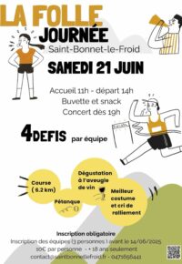 Le village de Saint-Bonnet-le-Froid vibrera au rythme du sport, du vin et de la convivialité le samedi 21 juin avec la première édition de La Folle Journée, un événement festif et décalé, pensé pour un public épicurien.