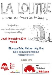 Projection commentée d'images exceptionnelles, le 10 octobre à 19h30 Dans le cadre des Soirées du Hérisson, FNE 43 vous propose cette soirée en compagnie de Jean-Baptiste Bor, le jeudi 10 octobre à partir de 19h30 à la Salle du Sourire intérieur à la Biocoop Echonature à Aiguilhe. Arpenteur inlassable des monts et merveilles du département, Jean-Baptiste Bor, Coubonais d’origine, se passionne depuis une vingtaine d’années pour la loutre, une espèce qui a frôlé la disparition en France et qui fait un come-back remarqué. Cocorico, c’est en Haute-Loire, en particulier dans les Gorges de la Loire et de l’Allier, que son retour semble le plus spectaculaire : on peut y voir l’animal à toute heure du jour. Autour d’un petit film tourné dans les Gorges de la Loire au gré de longues années d’observation, venez découvrir cet animal en tous points extraordinaire, véritable vif-argent des rivières, tour à tour féroce comme un lion, furtif comme une torpille ou joueur comme un petit chaton.