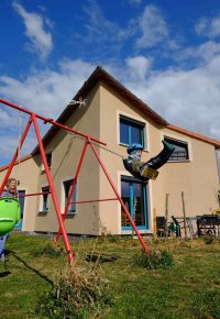 Je rencontre les heureux propriétaires un jour ensoleillé, mais froid. Gaston et Aurore ont un bonnet sur leur tête d’enfant. Benoit est en t-shirt, avec une doudoune à manches courtes, enfilée seulement parce qu’il a le rhume… sinon il s’en passe bien, souligne Angélique, qui m’explique qu’ils passent tous quatre beaucoup de temps dehors quelle que soit la météo.