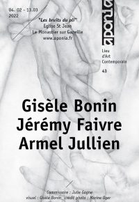 « LES BRUITS DU PLI » du 4 février au 13 mars 2022 Gisèle Bonin Jérémy Faivre Armel Jullien Commissaire de l’exposition : Julie Gagne Pli du temps, marque du temps, pli du paysage et des surfaces, pli de l’espace, espace du pli, pli d’où laisser advenir. « L’espace de notre vie n’est ni continu, ni infini, ni homogène, ni isotrope. Mais sait-on précisément où il se brise, où il se courbe, où il se déconnecte et où il rassemble ? On sent confusément des fissures, des hiatus, des points de friction, on a parfois la vague impression que ça coince quelque part, ou que ça éclate, ou que ça cogne. Nous cherchons rarement à en savoir davantage et le plus souvent nous passons d’un endroit à l’autre, d’un espace à l’autre sans songer à mesurer, à prendre en charge, à prendre en compte ces laps d’espace. Le problème n’est pas d’inventer l’espace, encore moins de le réinventer (…), mais de l’interroger, ou, plus simplement encore, de le lire car ce que nous appelons quotidienneté n’est pas évidence, mais opacité : une forme de cécité, une manière d’anesthésie » Georges Perec, Espèce d’espace Horaires : vendredi samedi et dimanche de 15h à 18h en semaine sur RDV pour les groupes. Tel : 06 20 49 36 90 Entrée Libre, gratuite et accessible aux personnes à mobilité réduite