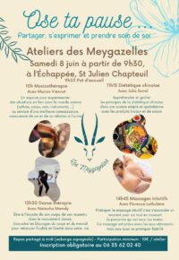 Les Meygazelles, un groupement capitolien de quatre praticiennes du bien être, vous donnent rendez-vous le samedi 8 juin prochain à l’Echappée, récent espace culturel de St Julien Chapteuil, pour participer à une journée découverte de leurs activités respectives.