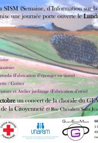 Dans le cadre des SISM Semaines d'Information sur la Santé Mentale 2022, le GEM Galaxie organise une journée porte ouverte : 10h-12h : atelier cuisine 12h-14h : apéritif dînatoire 14h-15h : atelier tawashi (fabrication d'éponges en tissu) 15h-16h : café causette/goûter 16h-17h : atelier peinture et atelier jardinage (fabrication d'oyas) GRATUIT Ouvert à tous