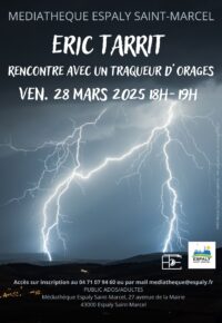 Photographe expérimenté dans les phénomènes météorologiques, Eric TARRIT vient animer une discussion sur sa façon de procéder pour prendre des photos d’orages. Agrémentée de vidéos, clichés, anecdotes et touches d’humour; il aborde le sujet de manière ludique et surprenante ! Une exposition de ses clichés sera accessible du 29 mars au 17 avril 2025 à la Médiathèque Espaly Saint-Marcel.