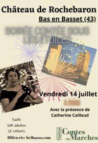 Soirée contée sous les étoiles dans le cadre du festival Contes en Marches du collectif konsl’diz, avec Catherine Caillaud. Au château de Rochebaron. Pour clôturer la soirée, vous profiterez d’une vue imprenable sur le feu d’artifice tiré à Bas-en-Basset.