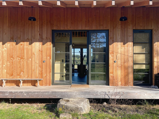 Cette autre particularité, se tenir à 1 mètre du sol, nous donne l’impression qu’elle flotte sur le paysage. Accentuant le mirage, une imposante pierre brute (photo) sert de marche à l’entrée nord. Choix esthétique ou attention portée au détail symbolique ? La pierre d’entrée marque la jonction entre la terre et l’espace habité. Nous nous élevons d’un seul pas et nous voici sur la coursive de bois de douglas, 70 m2 un ponton entre la terre ferme et l’espace habité. Coïncidence ? Ludovic et Delphine ont vécu plusieurs années sur un bateau à Paris. La crainte que leurs enfants ne tombent un jour dans la Seine les a fait revenir à terre, mais Dignac navigue dans cet entre deux, un compromis entre un idéal de vie en connexion avec la nature, et le plaisir-confort d’une construction humaine savamment orchestrée.