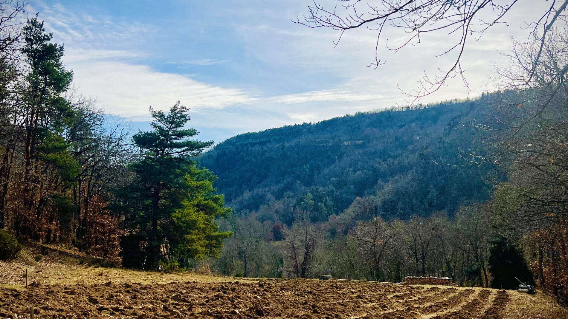 30 janvier 2024, je rends visite à Vincent. Direction le hameau de Peyredeyre situé sur la commune de Chaspinhac. Ce jeune entrepreneur plein de convictions me présente fièrement ses nouvelles parcelles qu’il s’apprête à planter sur des sables granitiques, orientés sud/ouest. Il fait chaud. La différence de climat avec Rosières, pourtant à quelques kilomètres, est flagrante. Arrivés sur place après une courte marche, nous observons en silence cet environnement idyllique : des falaises de granite surplombant la vallée de la Loire bordent des forêts de pins boulanges dans lesquelles se cachent d’anciennes terrasses de vigne qui semblent défier la gravité.